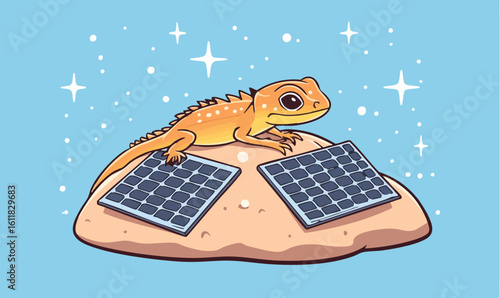 Cute lizard basking on solar panels under a starry sky, embracing renewable energy innovation