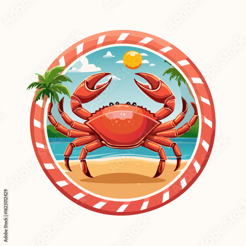 Vibrant crab illustration basking in the sun on a serene tropical beach landscape