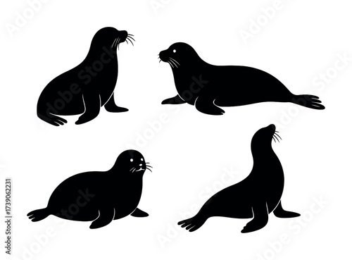 Silhouette collection of sea lions in various poses on white background