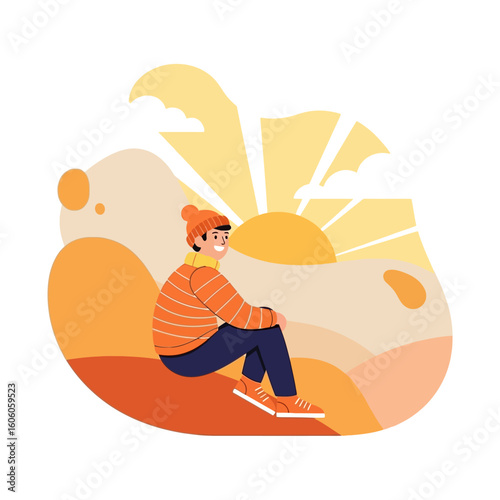 A happy young man in a beanie and scarf sits on a hill, basking in the warm sunlight.