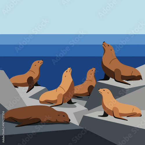 Several seals rest on rocks by the ocean.