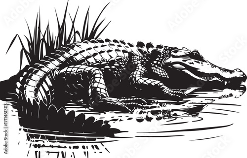 Alligator in Water: A meticulously crafted grayscale illustration showcases a powerful alligator basking in tranquil water, embodying a sense of ancient resilience and natural beauty.