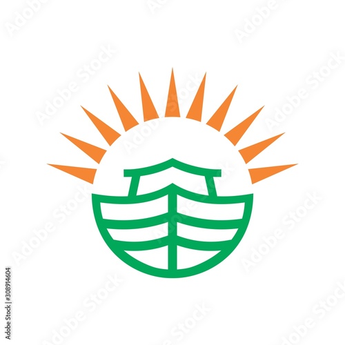 Logo of Noah's Ark. Rainbow - a symbol of the covenant. Dove with a branch of olive. Ship to rescue animals and people from the Flood. Biblical illustration.