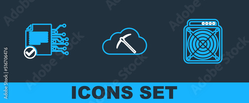 Set line ASIC Miner, Smart contract and Cryptocurrency cloud mining icon. Vector