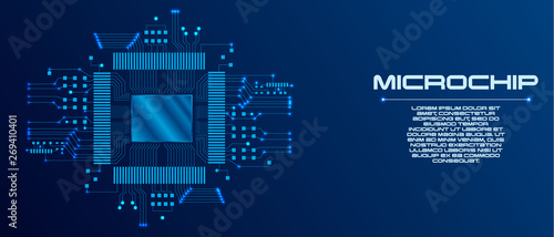 Presentation microchip processor with lights and glow effects. Futuristic CPU AI, Quantum computing, Big data concept. Web banner central computer processors. Digital microchip CPU. Vector banner