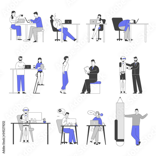 Set of Male and Female Business Characters Boring in Office, Sleeping at Workplace, Coffee Break. People in Customer Support, Robot Job Hiring Isolated on White Background. Linear Vector Illustration
