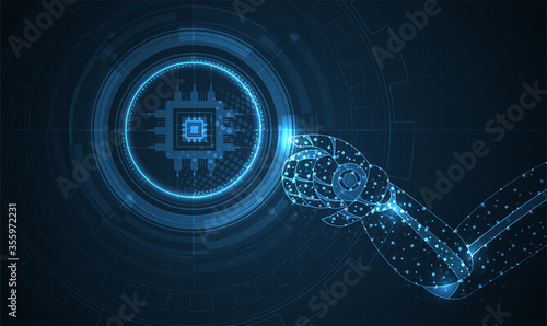 Futuristic microchip processor lights on blue background. Artificial intelligence. Robot  AI control production line on smart factory. Automatization of factory idea. Production of processors, chips