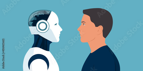 The robot collaborates with a team of people wheel bringing business people team to success. A man leads a team of humans and artificial intelligence aboard a boat. Vector illustration