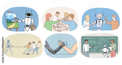 Collection of digital robot assistant in daily life of people. Set of cyborg or ai helper in person everyday routine. Artificial intelligence and modern technologies. Vector illustration.
