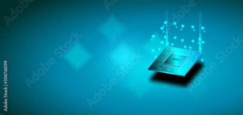 Quantum computer, large data processing, database concept.CPU isometric banner. Central Computer Processors CPU concept.Digital chip Futuristic microchip processor with lights on the blue background.