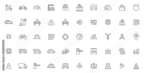 Traffic and road line icons collection. Street, transport,traffic sign, fuel, vehicle, location, car service icons.Traffic and Road signs. Stroke line icon collection