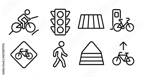 Urban Cycling Icons. Outline icon set of urban cycling infrastructure: bike path, traffic light, crosswalk,