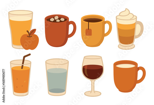 Colorful variety of hot and cold beverages in cups and glasses