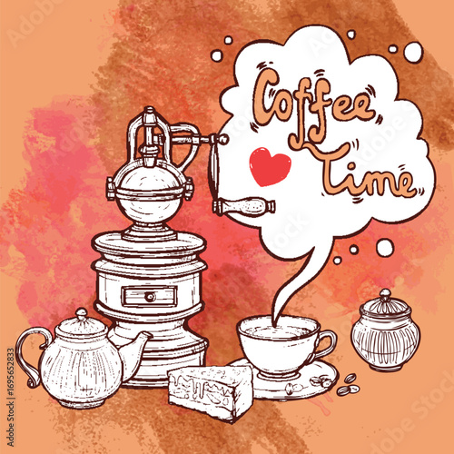 Hand drawn coffee time scene with vintage coffee maker and teapot on artistic background