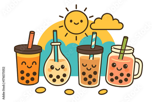 Cute boba tea characters on a sunny day. Kawaii bubble tea drinks with happy faces in flat vector style. Fun cartoon illustration for summer refreshments and beverages.