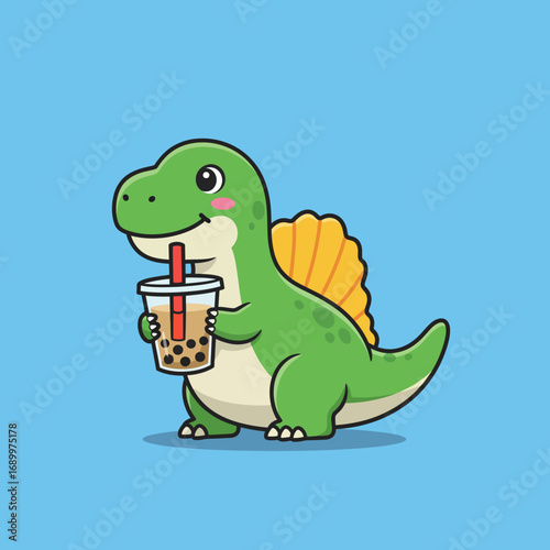 A cute dinosaur character holding a bubble tea drink, smiling against a blue background.