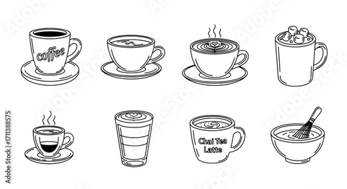 Diverse Coffee and Tea Collection A Black and White Line Art Set