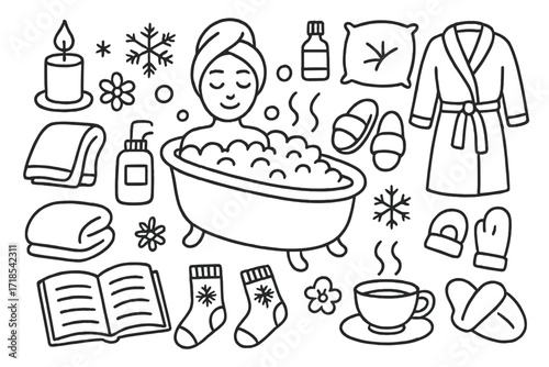 Winter Bath Relaxation. Hand-drawn doodle illustration relaxation in winter bubble bath, candle, bathrobe, slippers, steam, towel, lotion, book, tea cup,