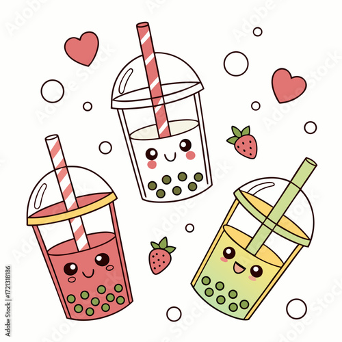 Vector art of a delightful bubble tea illustration, featuring colorful drinks with cute faces, hearts, and strawberries, perfect for a sweet and playful design