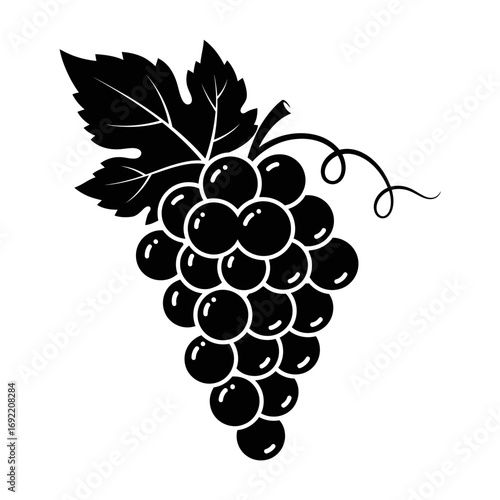 Black grape cluster silhouette with leaves in a minimalist vector style, simple design representing freshness and natural food