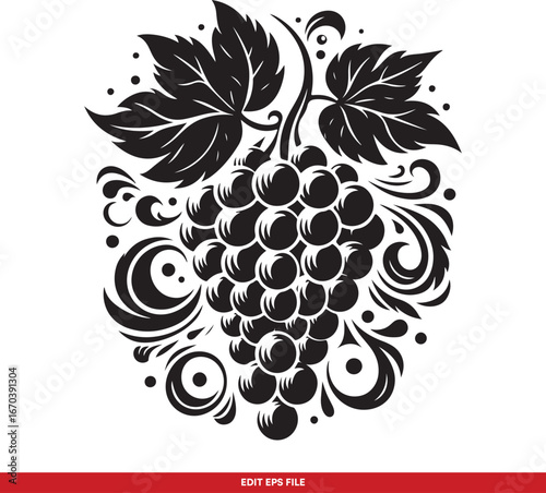 Detailed black and white illustration of a ripe grape cluster with leaves silhouette