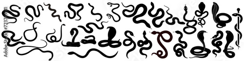 Set of Black King Cobra logo. Snake Tattoo. Indian cobra illustration, drawing. Vector illustration, aggressive and evil spectacled cobra or Naja naja. Vector graphics to design