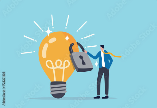 Intellectual property, patented protection, copyright reserved or product trademark that cannot copy concept, businessman owner standing with light bulb idea locked with padlock for patents.
