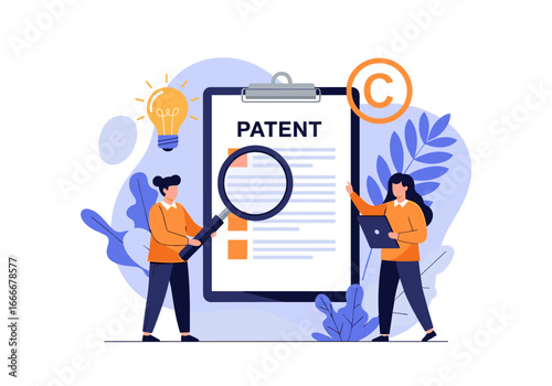 Intellectual property and legal copyright protection tiny person concept. Patent protection for new innovations, ideas and patents vector illustration. Author security for information piracy threat.