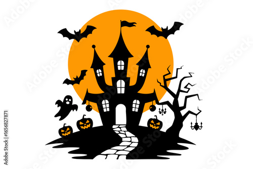 Cartoon illustration of a spooky haunted castle on a hill.