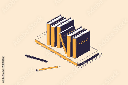 Online reading concept, smartphone with books inside. The book flies out of the phone screen. Distance learning and education. Isolated vector on white background