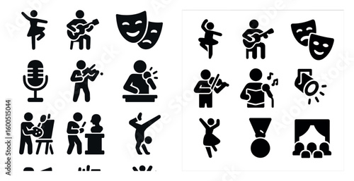 Theater, performance silhouette icon set. drama, stage entertainment icons collection