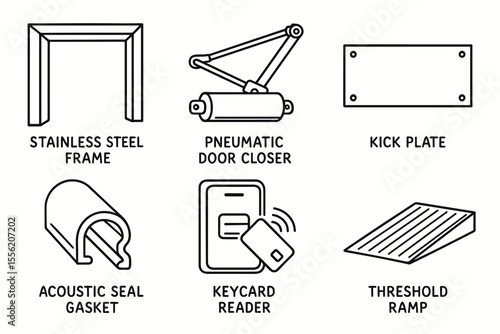 Accessible Entrance Icons. Outline icon set of wheelchair accessible entrances: ramp, automatic door button, wide doorway,