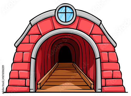 A yellow underground shelter with a ramp and double doors, isolated on white background, designed for emergency safety and protection