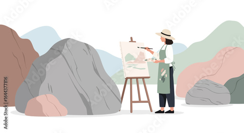 Happy female artist standing at easel and painting flat vector illustration. Cartoon painter with palette drawing new masterpiece. Creative profession and hobby concept