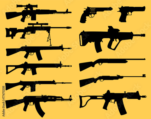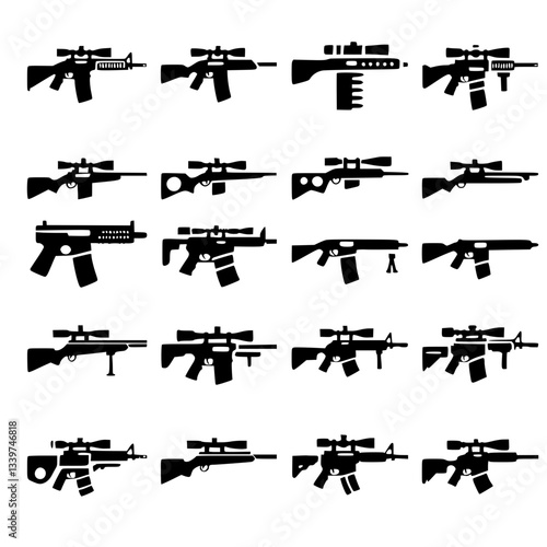 Black silhouette collection of rifles and machine guns. Isolated weapon icons on white background, ideal for military, army, war, and security design use.
