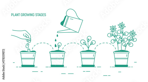 Growing phases of potted plant - seeding, germination, watering of seedlings, blooming. Life cycle of houseplant drawn with green contour lines on white background. Monochrome vector illustration.