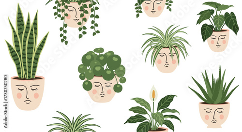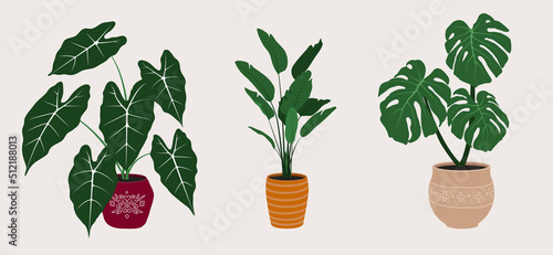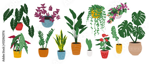Set of house plants in pot flat vector illustration. Decorative indoor flowers.