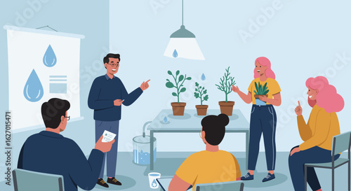 Diverse group discussing indoor plant care in a meeting setting. Vector illustration