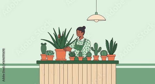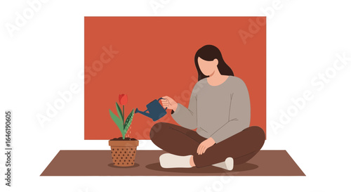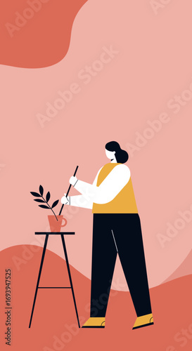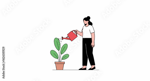 Minimalist illustration of a person caring for a potted plant at home, symbolizing growth, hobby, and a connection to nature. Ideal for lifestyle, wellness, or environmental concepts.