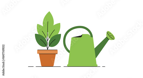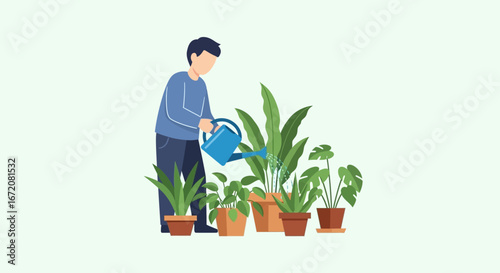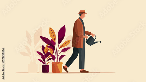 Simple Flat Illustration of a Man Watering Plants with a Watering Can