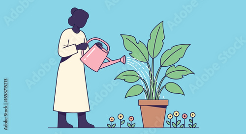 Woman Watering Potted Plant Simple Illustration on Blue Background