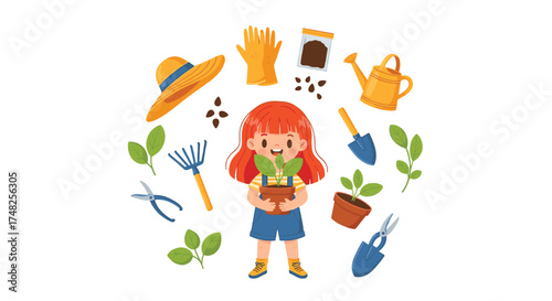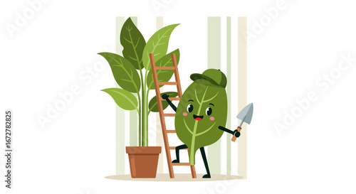 Cheerful Leaf Gardener Tends To The Potted Plant With Ladder And Trowel With Charm