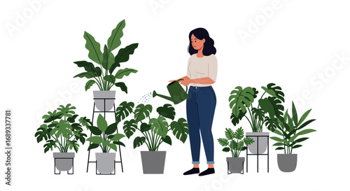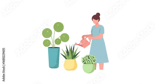 Woman Watering Potted Plants Indoor Gardening and Plant Care Illustration.