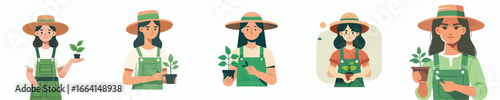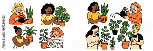 Set of diverse women caring for houseplants, including watering, pruning, and holding potted plants like monstera and snake plants