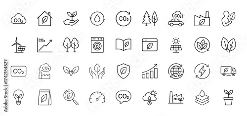 Environmental sustainability line icon set. Vector pictograms of CO2, house, plant, water cycle, wind turbine, solar panel, global earth, and leaves, thin linear illustration.