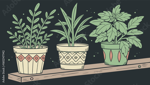 Illustration of potted plants on shelf indoor plants home decor plant care botanical art drawing style