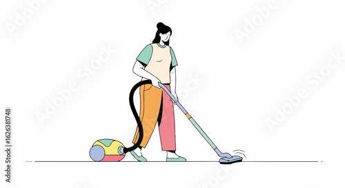 Young woman using vacuum cleaner for home cleaning.  Indoor cleaning activity shows person vacuuming apartment floor.  Relaxing domestic lifestyle scene for home cleaning ads.