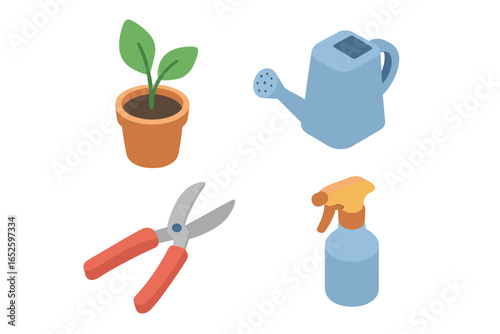 Isometric houseplant care tools set. Potted plant icon, watering can, pruning shears, spray bottle. Gardening equipment for indoor plant maintenance, cultivation, horticulture. Vector illustration.