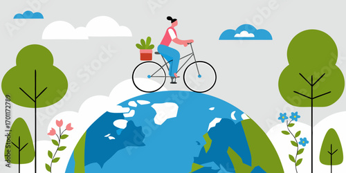 Woman riding a bicycle on top of the earth with trees and flowers around her