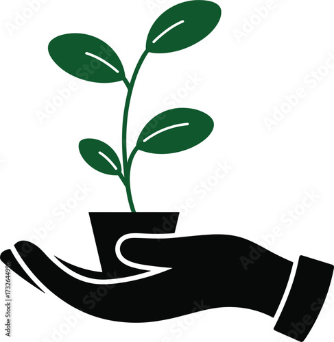 Black Silhouette Icon of a Hand Holding a Potted Plant with Two Green Leaves Keywords: hand, holding, plant, pot, seedling, sprout, growth, gardening, nature, life, care